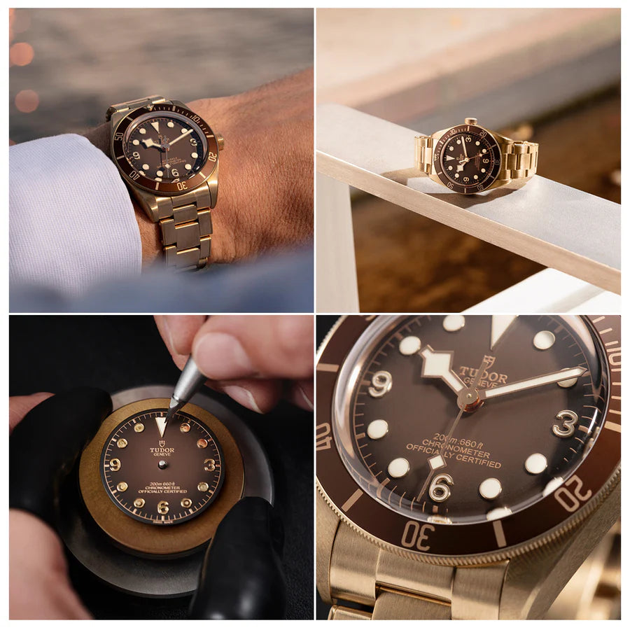 A tribute to the brand’s naval heritage, the TUDOR Black Bay Fifty-Eight Bronze is a timepiece like no other. This boutique-exclusive timepiece has a 39mm satin-brushed bronze case that evolves over time, developing a patina unique to its wearer. The “brown-bronze” dial with Arabic numerals at 3, 6, and 9 o’clock is paired with TUDOR’s signature snowflake hands for a bold, vintage-inspired look. Inside, the watch is powered by a COSC-certified Manufacture Calibre MT5400, and comes with a 70-hour power reserve. The timepiece is fitted with a full-bronze bracelet that features TUDOR’s T-fit clasp for quick adjustments, while a complementary "brown-bronze" jacquard fabric strap completes the set.